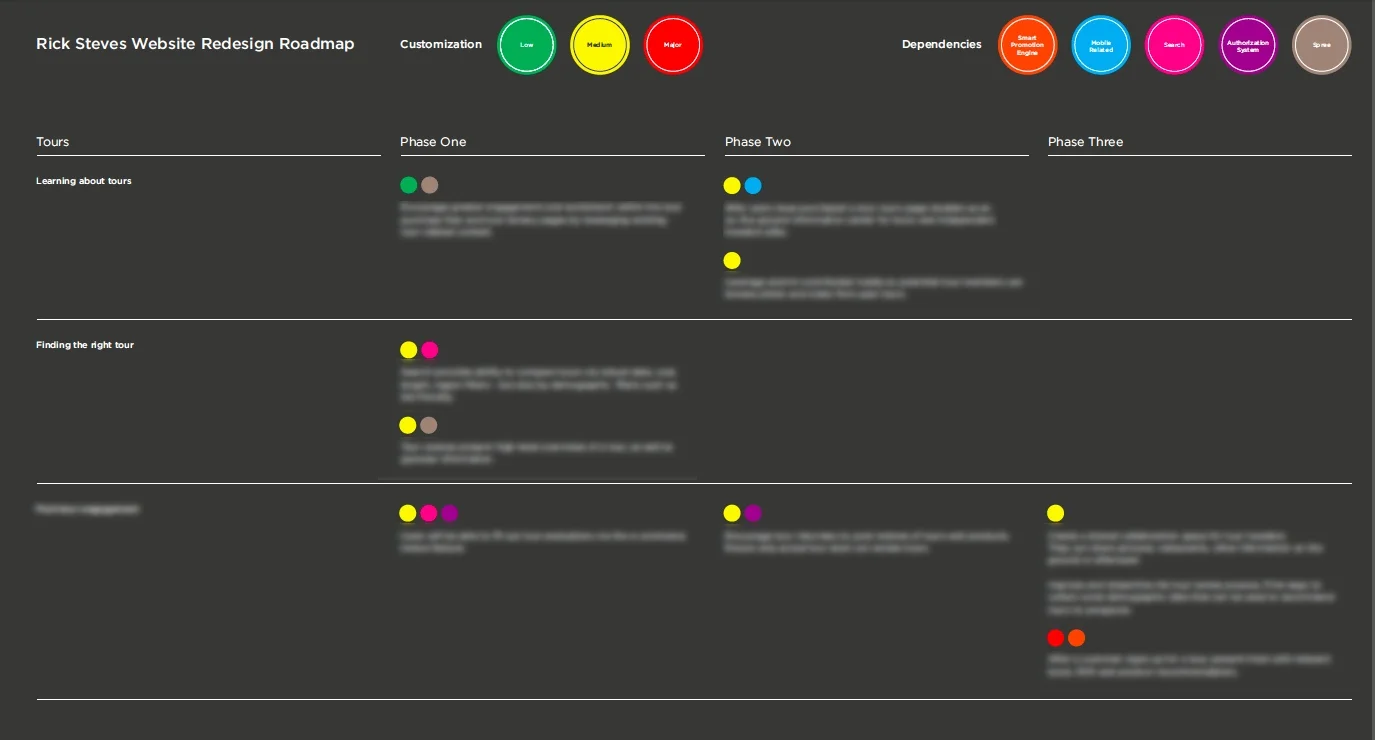 Before we could kick off a redesign, we needed to align Rick Steves stakeholders and GLG strategists on business, technology and user needs. To ensure that the features and functionality we included in the roadmap would bring the most value to travelers - and the business - we looked at how we could serve each type of user at each part of the travel experience.